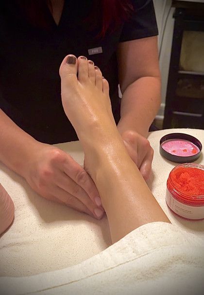Give your feet a moment of pure Holiday Bliss. This refreshing upgrade begins with. an aromatic peppermint sugar foot scrub that gently buffs away skin, leaving your feet feeling soft and renewed. Next, we will massage your feet with our cashmere peppermint lotion followed by using warm towels on your feet.